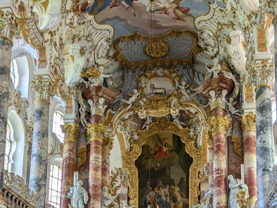 ドイツといえば有名なのがノイシュバンシュタイン城。大きくてその美しさは有名だけど、私が気になったのはヴィース教会。世界遺産らしいんだけど、ロココ調の華やかで美しい内部をSNSで見かけて「行ってみたい!」という思いがつのり、今回ようやく行ってこれたよ。外観は小さくて質素なんだけど、入ってみるとびっくり!中はキラキラ輝くような美しさで見入ちゃった!「天から降ってきた宝石」って言われるのが納得したよ。この教会を見に行くだけでもドイツに行った甲斐があったなぁ。