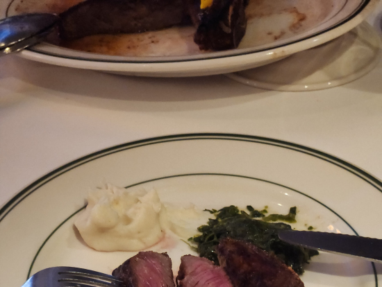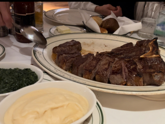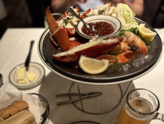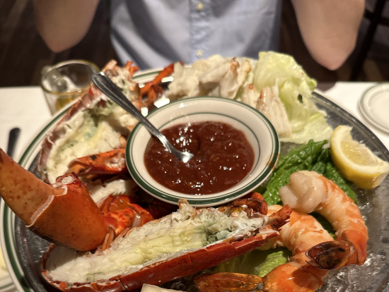 円安で厳しかったですが、Tボーンステーキは絶品で、付け合わせのほうれん草ソテーとマッシュドポテトもおいしかったです。最初に来るカニ、オマール海老、エビも見た目が華やかで豪華でした。