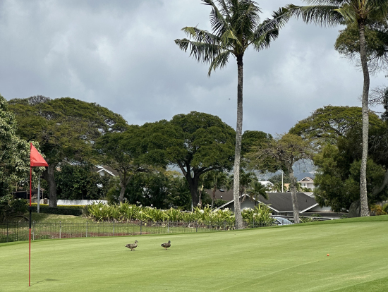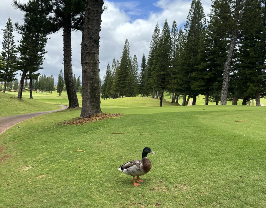 ところどころで「カルガモ」や「シロサギ」や「赤いトサカの小鳥」が間近に姿を見せてくれたのは楽しかったです。あるホールではグリーン上に「つがいのカモ」が横断しながら、私のボールを覗いて通り過ぎるという場面もあってゆったり穏やかな気持ちに包まれました。