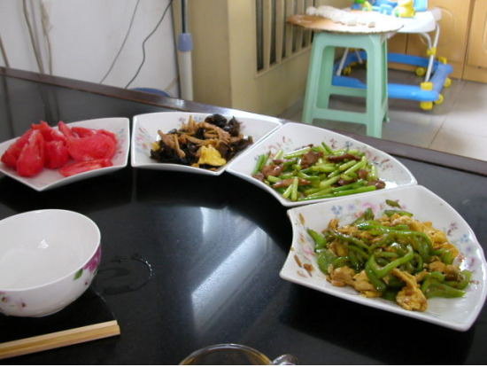 なんとか4人分の餃子を作り終わると、奥様が餃子を茹でて下さり、他に豚スペアリブの煮たもの、トマトと玉子の炒めもの、青椒肉絲、じゃがいものの炒めものと一緒にいただきます。