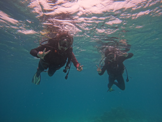 夫婦共に初ダイビングだったため、1ダイブ目は慣れず全然上手いこと泳ぐことが出来なかったけど、休憩のときに呼吸を使って泳ぐことを説明いただけたので、2ダイブ目はコツを掴み、大分上達することができました!