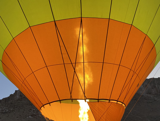 当日、気球搭乗まではチャイとスナックのサービスがあり休憩して待ちます。そしてクルーの案内でゴンドラに乗りこみ出発。ゆっくりと浮上していく中、朝焼けを受けた奇岩を見下す景色は感動です!