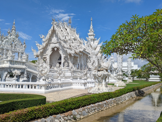 タイのチェンマイから足を伸ばして行ってみたのが、名前がちょっと似ている街チェンライ。純白の寺院で有名なワット・ロンクンはまだ新しい寺院だそうなんだけど、精巧な彫刻は見応えがあり、特に地面から無数に出ている手の彫刻にはビックリ!怖いくらいの迫力があった。そして、ゴールデントライアングルと呼ばれるのはタイ・ラオス・ミャンマーの国境が接しているところ。かつては世界最大の麻薬密造地帯だったらしいけど、今は取り締まり強化と経済成長により活気ある商業地域になっていたよ。そして、展望台から見る3つの国がメコン川で接する光景は一度見てみたかったので、思い切ってここまで来て良かった!