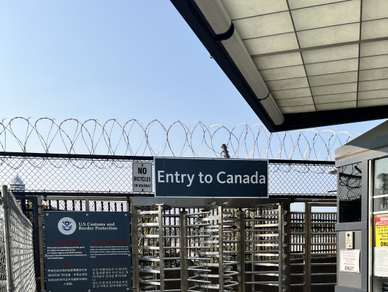歩いて国境を渡る時に、アメリカ側からカナダへ行く時はパスポートのみですが、カナダからアメリカは戻る時に1ドル(カナダドルでもアメリカドルでも)が必要です。両替機もありますが、50ドル札以上は両替が出来ないので、あらかじめ細かいお金を持っておく事をオススメします。