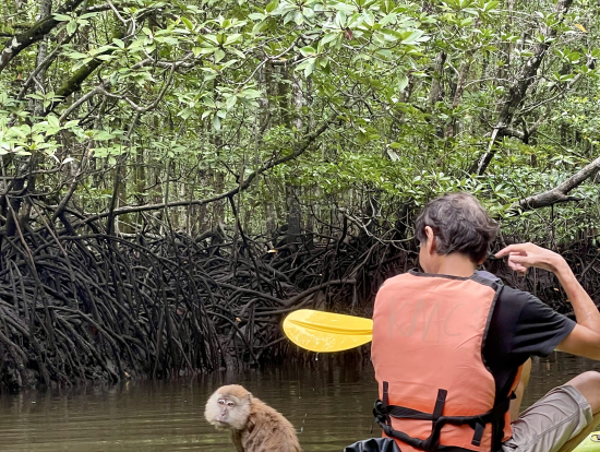 そのまま拠点となる水上レストランへ移動し、少しカヤック練習をしてからいよいよ川の上流へ向かいます。この日の川の流れは緩やかで、ゆったりとマングローブ、サル、オオトカゲなどを見ることができました。