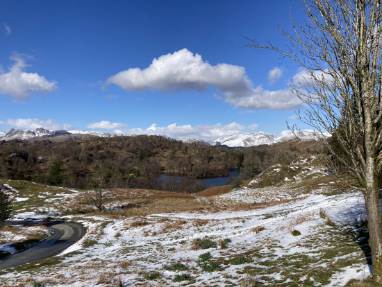 3月の積雪は湖水地方でも珍しいようでうっすら雪化粧の山々の様子と冬でも青々とした緑とのコントラストがとても綺麗でした。(ガイドも珍しいと写真を撮ってました)
