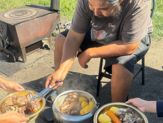 - 現地のゲルの方が振る舞ってくださった羊肉の石焼は絶品です。ビールとすごく合います。