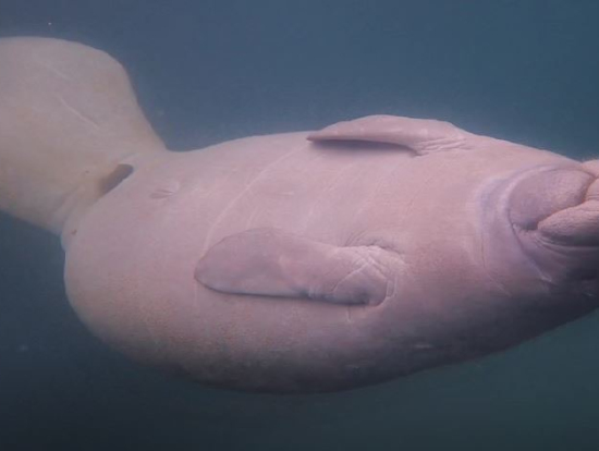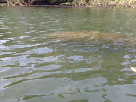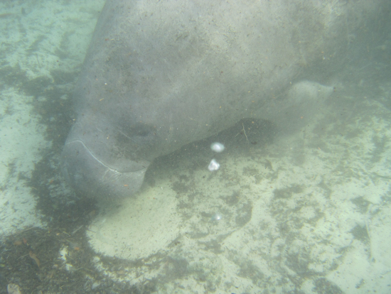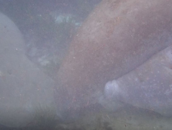 寒い頃がシーズンだと聞いていたので、会えないかもと、心配していましたが、会えました。意外に、岸から、すぐのところに、いました。水の透明度は低いのですが、ガイドの方に、この辺を見てろと言われて、待っていると、自分が浮いているところの真下に、マナティが、ぬうっと現れて、マナティの上に、自分がのかってしまうのではないかと心配になる感じでした。触ってみると、温かくて、ぬるっと、してました。背中を触ったくらいでは、なんとも思わないようです。透明度のせいで、すうっと、動いていって、いなくなる感じです。夏休みでも、きっと、会えると思います。写真は、ホモサッサ公園の水中展望台から撮ったマナティです。だいたい、こんな感じですが、一緒に泳ぐところは、こんなに透明度は高くなく、水深は、ずっと、浅いです。魚は、見えません。一緒に、泳ぐところは、水深1メートルも、ないと思います。ただ、ボートで行くので、ボートを留めるところは、足は、つかない深さです。