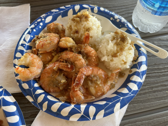 有名店のジョバンニで食べたガーリックシュリンプは大きいエビにガーリックがたくさんでとても美味しかったです。しかし食べるのは外だったので野生のニワトリやスズメ、ハエが寄ってきて少し怖かったです。