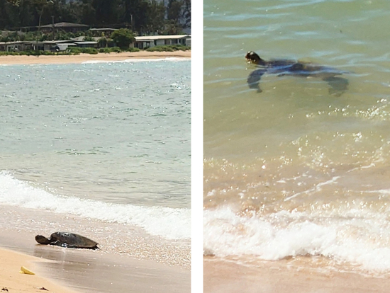 ノースショアでは、念願のウミガメが数匹目の前を泳ぎ、1匹が上陸する姿も見ることができ、街での買い物も楽しめました。