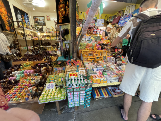 メークロン線路市場は、私が行った観光名所の中で一番良かったと感じる場所でした!線路際ぎりぎりまでお店がひしめいていて、線路の上を道のように観光客が行きかう光景が何とも言えない不思議な感じがしました。とにかく観光客が多く線路の砂利や石で歩きづらい中、お土産をいくつかゲットしました!この場所のお店は安く買えると聞いていたので、タイパンツやスカーフなどそのまんまの値段で購入できました。