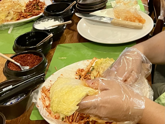 友達5人で参加しました。他にも2グレープ、合計12人でした。最初にオミジャ茶を頂き、それからキムチ作りです。最後にキムチチヂミととうもろこし茶を頂きました。先生は、英語、中国語、日本語を使いながら