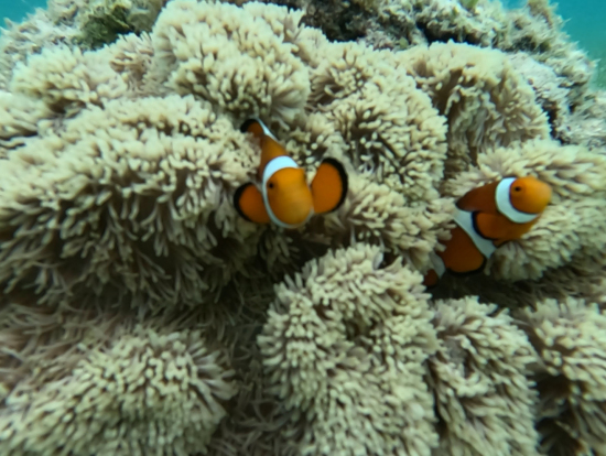 シュノーケリングで何度も見てきた熱帯魚たちを、下から見上げるという新鮮な体験。水色の小さな魚の群れが頭上に舞い、シマシマの魚たちが目の前を横切ります。クマノミの親子がゆらゆら揺れるサンゴの中からじーっと様子を伺っています。