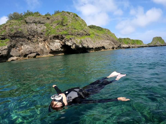 青の洞窟 シュノーケリング 那覇空港送迎可で到着日・最終日にも参加可能!<ボートエントリー/送迎または恩納村発>ガイドさんはchronsのオガタソヨグくん。とても優しく海に詳しいダイビング経験豊富な若者でした。ウェットスーツ着るのも初体験の四苦八苦している私も安心出来ました。