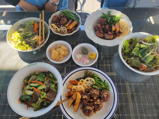 料理が完成し、屋上テラスでの食事は、本当に気持ち良かったです。トックもごちそうさまでした。お天気にも恵まれ、大好きなソウルの町を眺めながらの食事は最高でした。