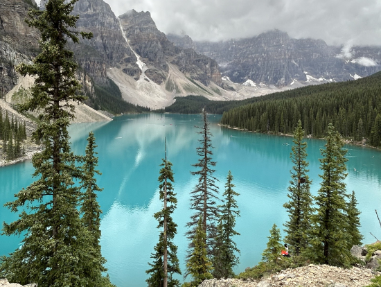 モレーン湖は、10分程岩山の遊歩道を登って行くとあのよく見る写真の景色を見ることができます。曇り空でしたが、テンピークスとのコンビネーションが本当に綺麗、壮観でした!