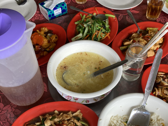 昼食は、スープ、チャーハンとおかずが4皿、スイカでした。かなり豪華になっています。