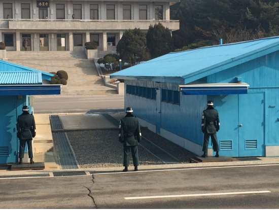 当日は特別な軍事訓練の期間中で、普段以上にフル装備をした兵士が道路のあちこちに配備されており、緊迫感を感じました。板門店ではテレビで見たまんまの光景が広がっており、何枚か記念撮影もしましたが、笑って撮影できる雰囲気ではありませんでした。このような状況は日本ではまずありません。地続きの国境がない日本では、こういった緊張を伴うにらみ合いを経験することがありません。良くも悪くも日本人は平和ボケしていることを痛感させられました。
