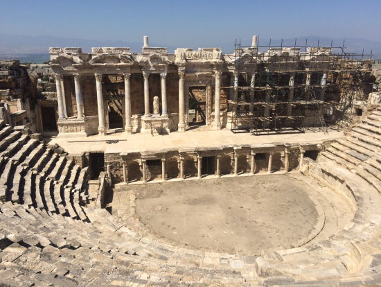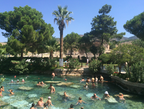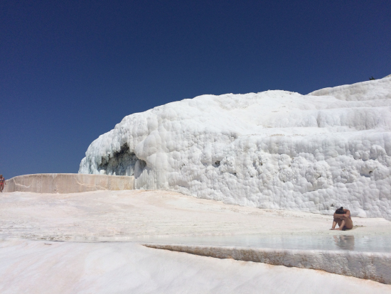 石灰棚はとても雄大で自然の凄さを体感させてくれる素晴らしい景色でした。早朝出発のスケジュールでしたが、参加してよかったと思いました。幸運にも参加者1名で、スケジュールはフレキシブルにできたので、楽しみにしていたテルマルで多めに時間を使うことができました。ぬるめの温度でしたが、プール気分もありながら温泉楽しめました。遺跡がそのままという設定もユニークですね。ヒエラポリスの遺跡巡りは劇場に行くだけで他のネクロポリス等の遺跡は案内されませんでした(後からチェックして気がつきました)。他は全体的によかったので、ここでミソつけられた感が少々残念。