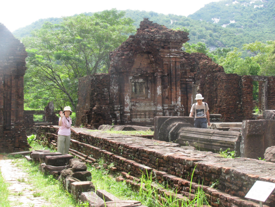 初めてのベトナム旅行の二日目、夫と二人で心細かったのですが、親切なガイドさん、安全運転のドライバーさんのおかげで、ダナンのホテルから遺跡までの二時間ほどのドライブ中も楽しめました。オートバイの行き交う街、独特の編笠をかぶって農作業に精出す人々、放牧された牛やあひるの群れ等ベトナムの町や村が温かく迎えてくれている様でした。周りを山に囲まれたミーソン遺跡は、まだ人も少なく(帰る頃にはいっぱいの人達でした)静かに観られました。かつて栄えたチャンパ王国のレンガの建物、壁を飾る女神像、草むらに立つ石像など間近で見られ幸せな時間でした。しかしベトナム戦争による爆撃の大きな穴もあり、心が痛み現在の平和に心なごみました。最後にチャムダンスショーの異国情緒に感動し、シヴァ神の置物をお土産に、九百年間の王国の聖地を後にしました。ホテルに着き余韻に浸っていると、ガイドさんが言われた通り午後から大雨になり、本当にラッキーでした。