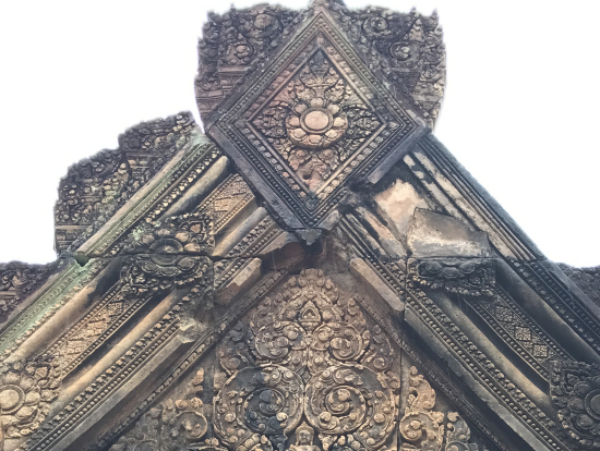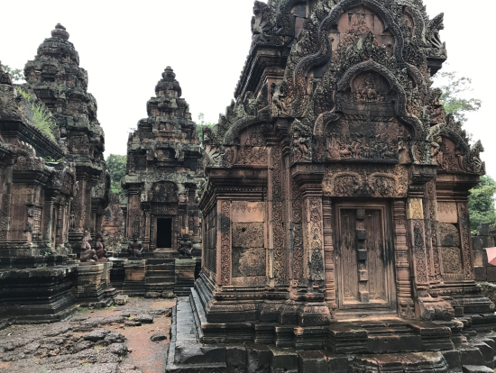 バンテアイ・スレイはアンコールトムやアンコールワットといった主要なアンコール遺跡から遠く離れています。車で30分ほどで到着です。朝から降っていた雨も小ぶりになり早速ガイドさんに中を案内していただきました。。