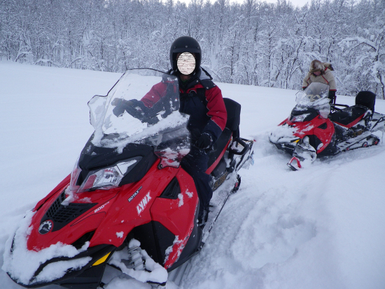 サミーのおじさんが運転するスノーモービルの後を、我々4人が2台のスノーモービルに分乗して疾走。