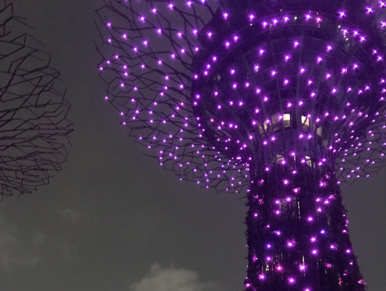 その後バスでガーデンバイザベイのナイトショーへ。あまり待つことなくショーが始まります。13分程光るツリーとマリーナベイサンズの高層ビルを楽しみましょう。