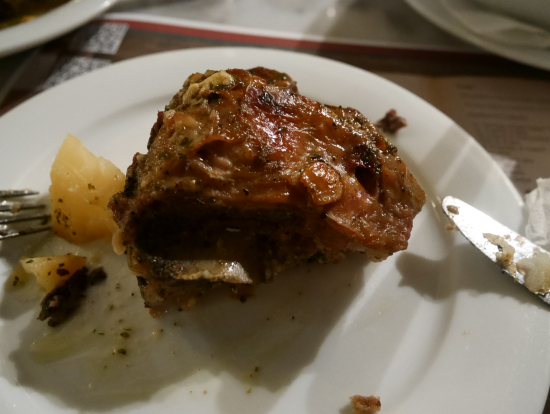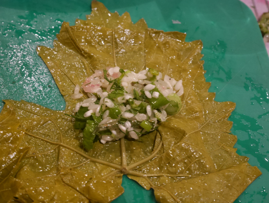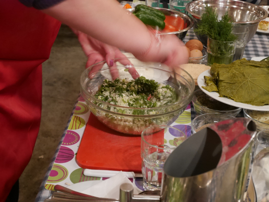 Diavlosというアゴラ遺跡すぐ傍のレストランに17:15に集合し、30分後に別室で開始でした。私が参加した日は私を入れて7名。私以外はアメリカ人の方でした。講師の女性からギリシャ料理、及びそれにまつわる食材について講義的な感じで話があり、一緒にウーゾというギリシャでポピュラーに飲まれているリキュールと、フェタチーズ、オリーブを振る舞われます。その後、ラム肉ブロックに塩、スパイスを練りこんだり、ドルマダッキアという味付けした米をブドウの葉っぱで包む前菜的なものの下準備をしたり、スパナコピタというほうれん草のパイの下準備をしたりします。実際に焼いたり煮たりというのはレストランの調理場で店員さんがするので、参加者はそれに立ち会うということはありません。最後にグリークサラダとグリークヨーグルトを使ったちょっとしたデザートを作って終了です。この時点で21:00でした。