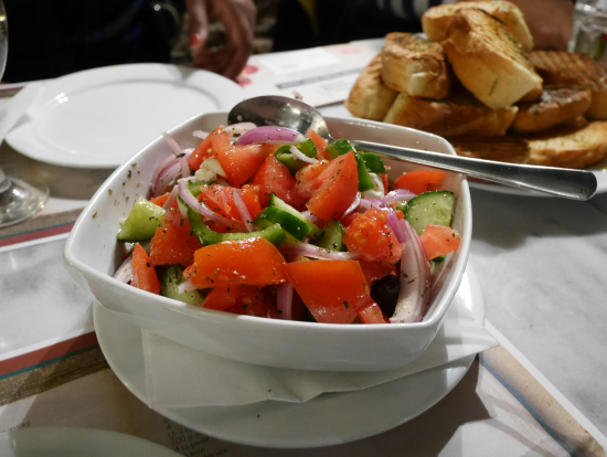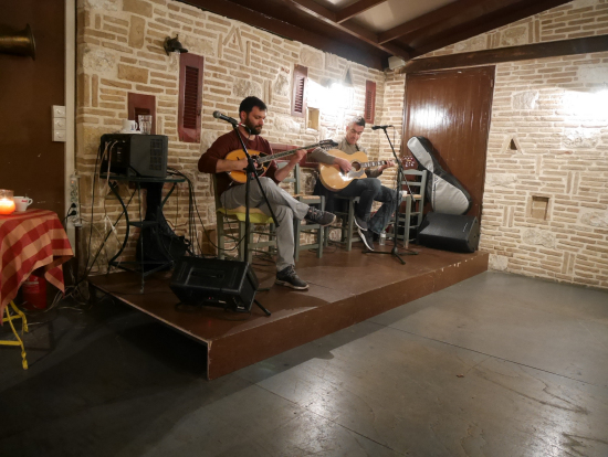 その際にビールかワイン、もしくは水を選ぶことができます。(水はお代わり自由)また、この日は演奏のサービスデーか何かで、ギリシャ人のアーティストが前でギリシャの音楽や民謡を演奏したり歌ったりしていました。(けっこう大音量)解散は特に決まってませんが、下準備したものが全部出てきて食べ終わると大体22時半くらいになります。