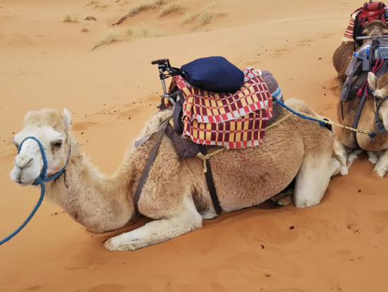 ベルベル人のラクダに乗ってキャンプへ2時間移動、大きな砂丘を前に見ながら気分を味わえた。ディナーで一緒になったルクセンブルグから来たという2組の老夫婦に、日本人は寝る時間だと、お休みを言ってテントへ戻る。天候があれてきたがテントの中にベッドがあり快適とは言えないがしっかり寝ることができた。