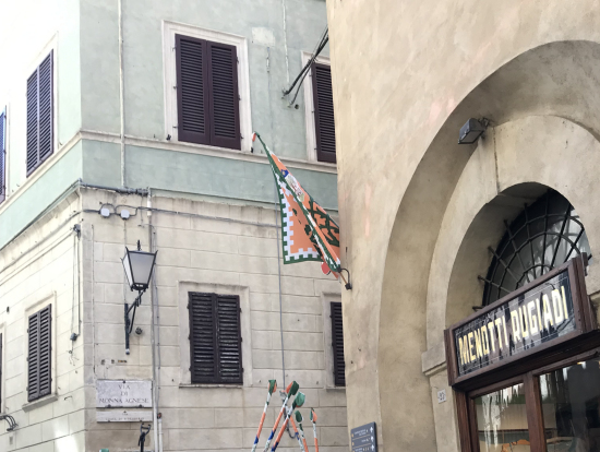 シエナのカンポ広場での競馬のイベントがそろそろらしくて、地元の少年達が大きな旗を街のあちこちにセットしていました。
