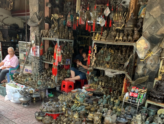 旅行最後の日に夫婦で参加しました。お寺では静かに祈る人や厄払いの雀など、バイクであふれた通りとは違う風景を見ることができました。(螺旋状のお線香は一週間燃え続けるそう)プラ籠もいっぱい買いました。ドンコイ通りで買うより断然安い。しかもデザインはほぼ同じで、卸し価格だそうです。骨董通りは土曜日のせいか人通りも少なくゆっくり見ることができました。最後はシクロに乗ってホテルまでドライブです。思ったよりゆっくり走りますが、車道を行くのでヒヤヒヤ。運転するおじさんが「アンゼン、アンゼンよ」と連呼するのも面白い。結構長い距離なので、暑い日は帽子が絶対必要。楽しい締めくくりの1日になりました。