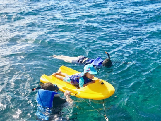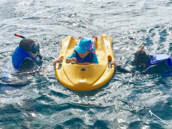 シュノーケリングのボードはたこめがねがちょうど顔あたりについており、2歳児でも容易に覗いて魚を沢山見ることができました。