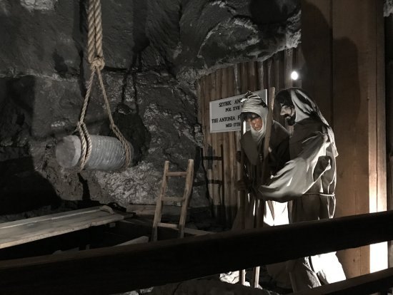 集合場所からバスで20分、現地での説明は2時間半ほどです。土日は混むということで38人の大所帯での行動でした。1人で参加しましたが説明がとても丁寧で何も問題はありませんでした。ほとんど全てが下りなのですが、ガイドさんの説明を聞きながらずっと階段を降り歩きっぱなしです。お土産コーナーを見る時間は15〜20分程ありましたが、紙幣はお店の人に嫌がられます(私の場合は使えませんでした)ので、小銭を持っていくことをオススメします。ボタンを押すと説明や音楽が流れたり人形が動くギミックが随所にあり、想像以上に楽しめました。