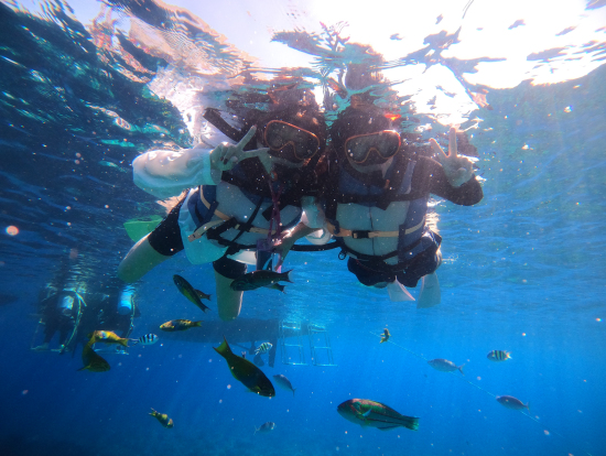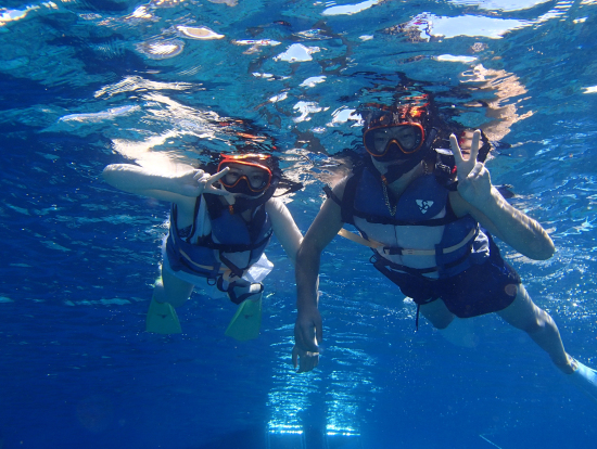 その後はシュノーケリングをし、綺麗な魚が身近に寄ってきて餌をあげたりと、とても飽きないシュノーケリングでした。クマノミやウツボや海ヘビやヤリイカも集団で泳いでいるのが見れました。この日はウミガメは見る事は出来なかったのですが、スタッフの皆さんはとても親切だし、知らない間にスナップ写真も沢山写してくれていました。とても良かったです。また今度、沖縄へ来た時はリピートしたいと思います。