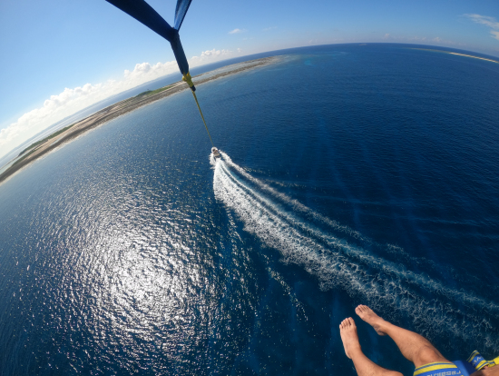 最初にパラセーリングをして、上空50mからの景色は最高でした。眼下には美しい青い海で珊瑚礁も透き通って見えているし、無人島のナガンヌ島やクエフ島等も望む事が出来ました。