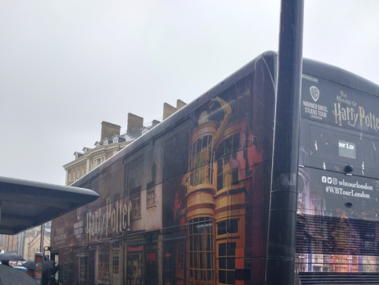 キングス・クロス駅から出発はきちんと時間通りでした。出発15分以上前にはバスが到着していて、座席は早い者順なので、二階が良ければ早めにバス停に並んでいた方が良いです。公式のラッピングバスは、各座席にスクリーンがついていてハリー・ポッターの映画や、ミニゲームが出来ますが、イヤホンは自分で持っていかないと音声なしになってしまいます。