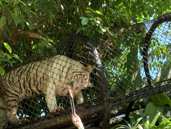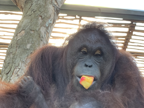 食事をしていると飼育員さんがオランウータンを始め、いろんな動物を連れて来てくれます。