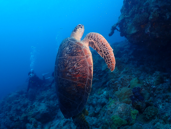 ウミガメさんたちがたっくさん泳いでて私は距離感を気にしたのですが、あちらは臆することなく泳いでて驚きました。これも日頃インストラクターの方々が大事に接してらっしゃる努力の賜物と感じました。