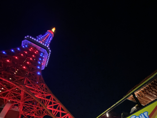 二階建てバスツアーは何度か乗ったことがありますが、今回のように東京タワー立ち寄りは初めてです。約1時間、十分にタワーを楽しめます。メインデッキではプロジェクションマッピングやツリーがとっても綺麗でした