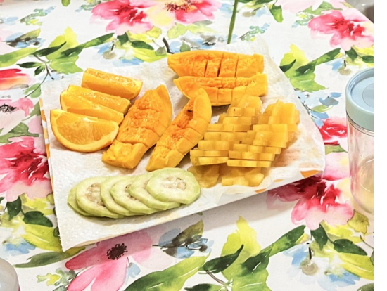 園内で採れたスターフルーツ、パパイヤ、グアバはいずれもよく熟されていて美味しかったです(写真)!他にもうちでは今とれないからと買ってきたバナナやマスカットを出してくださり、子供達もモリモリいただきました。残りはお土産にと持たせてくださいました!