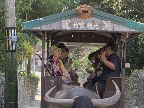 おとなしい牛に引かれのんびりと、ガイドさんの演奏しる蛇三線と島唄で観光案内。