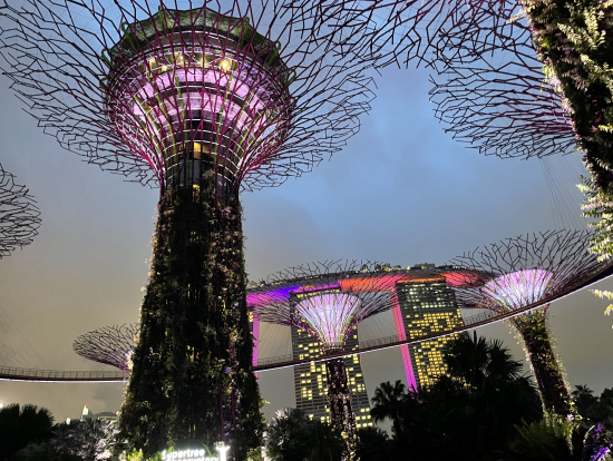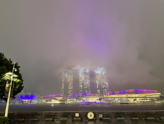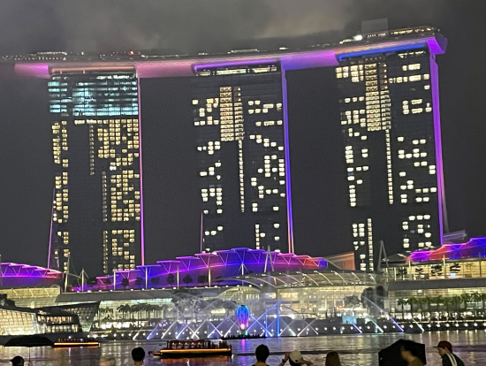 マリーナベイサンズのショーの時に土砂降りになり、前半部分はほとんどモヤの中でした。が、ガイドさんが雨に濡れずに見られる場所を案内してくださったお陰で、濡れずに見られました!後半は雨も通り過ぎてバッチリ!
