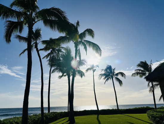 17:00スタートでアウラニから徒歩で10分前に到着しました。海辺で雰囲気が良く、椰子の木と夕陽の景色に癒されました。