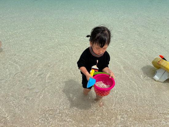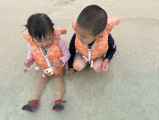 はての浜ではまず海の中に入り魚を見たりぷかぷか浮かんだりと一通り海を満喫した後、一度子どもたちを着替えさせましたが浜辺で砂遊びをしたりやどかりを見つけたりしているうちにあっという間にまたずぶ濡れに笑