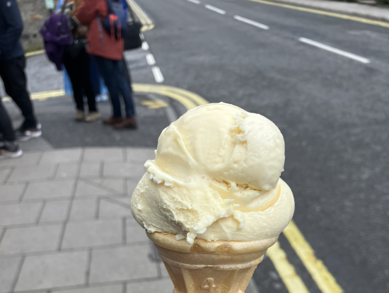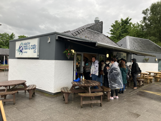 は雨は止んでくれました。クルーズ後は、帰路になります。途中ピトロクリーに立ち寄り、トイレ休憩。ドライバーに勧められたウイスキーアイスは、よかったです。最後、フォース鉄道橋を横目で見て、エディンバラへ戻り、解散となりました。バスの中が長いツアーでしたが、天気が雨だったため快適でした。また、バスを降りた時は