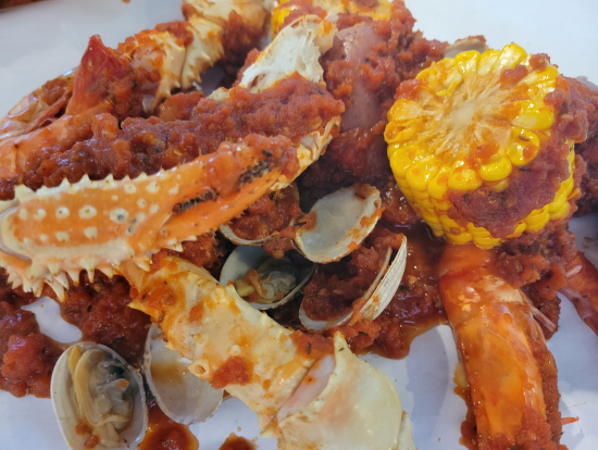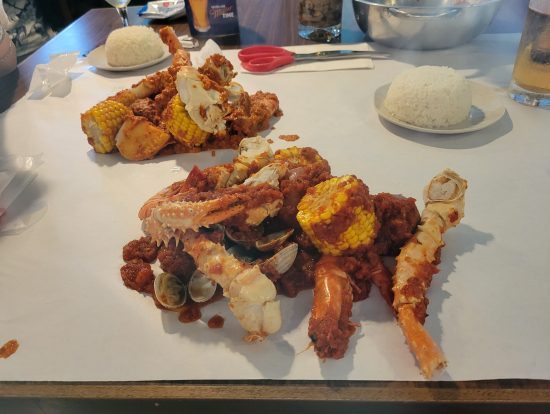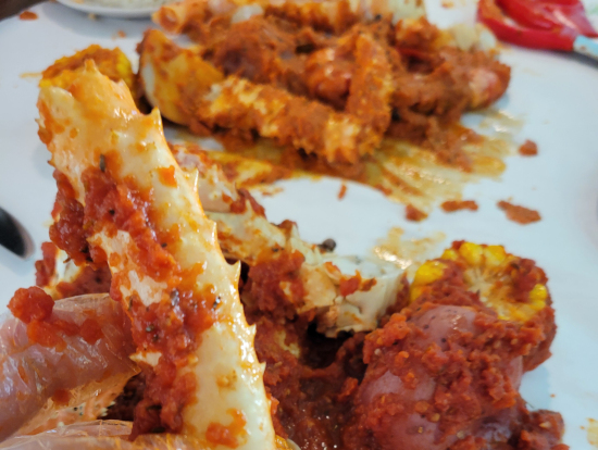 料理は非常に豪快で、テーブルの上にシートを広げて、その上に料理された蟹やエビをドーンと広げて、それを手づかみで食べます。ハマグリは小ぶりでしたが、蟹とエビは十分なボリュームがあります。個人的には蟹がしっかり身が詰まっていて美味しかったです。ただし殻が結構固くトゲがあるので、ちょっと手が痛くなってしまうので気をつけましょう。