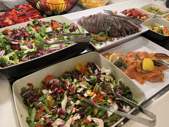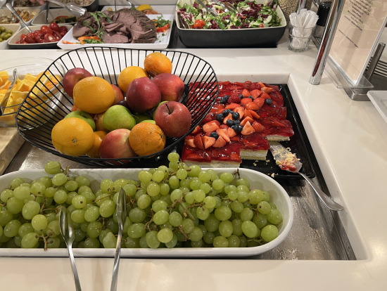 お料理も軽食だけかと思ったいたのに、各種サラダ、フルーツの他、スモークサーモンやローストビーフ、小エビにベリーケーキまで。