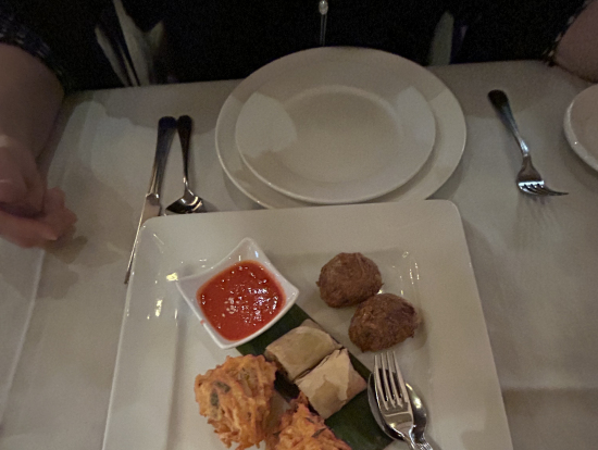 ちょっと早めに(30分も)着いてしまいましたが快く席に通していただきました。今回は本格的なマレー料理のディナーということでしたが、3時間前にケーキとお茶のおやつを食べてしまっておりました。前菜3種類、メイン4種類、デザート、飲み物だけ別でオーダーという内容でメニューの書き方が前菜を3種類出るけどメインは4種類から選ぶものだとばかり思っていたら全部出てきました。チキン、ビーフ、魚、野菜、結構な量で少し残してしまいました。もし行くならお昼以降、おやつなどは食べずに行くことをお勧めいたします。。スタッフさん達がかなり沢山いらっしゃり料理が食べ終わる絶妙なタイミングで次の料理が出てきます。皆さんフレンドリーで雰囲気は大変良かったです。