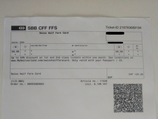 為替よりかなりレートが悪かったのでSBBで購入しようか迷いましたがこちらで購入しました。送られてきたメール内のチケットをスクショするかプリントアウトして持っていけばOKです。チケット購入の際は必要なく乗車中に車掌さんが回ってきた時に見せればいいです。今回13歳の子がいたのでファミリーチケットを持っていればほとんど無料になったのがよかったです。